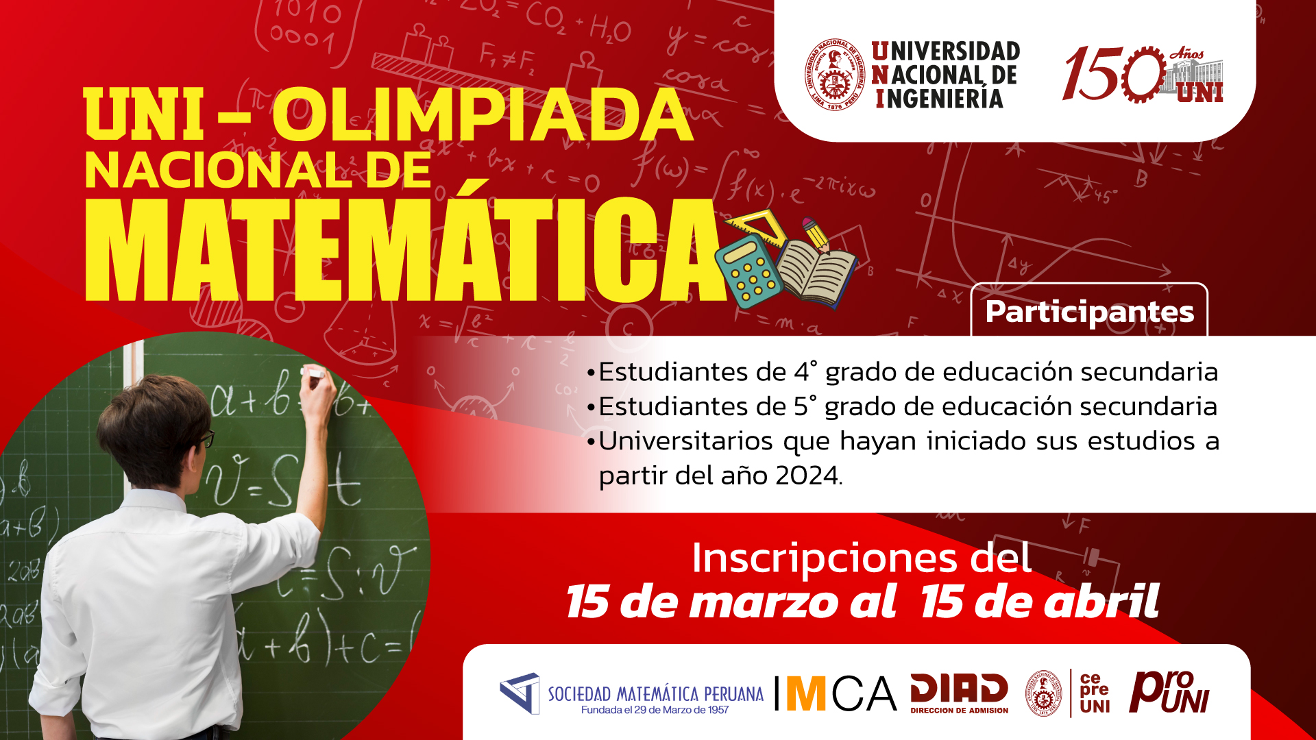 La Universidad Nacional de Ingeniería (UNI), en el marco de la conmemoración de sus 150 años de vida institucional, organiza la UNI-Olimpiada Nacional de Matemática, como un proyecto académico de alcance nacional orientado tanto a estudiantes de educación secundaria como a estudiantes universitarios de los primeros años de instituciones públicas y privadas del país.